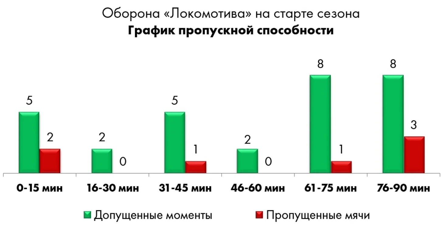 В отличие от прошлого сезона, когда «Локомотив» очень здорово проводил вторые таймы и выгрызал множество побед в концовках, ныне команда Сёмина резко сдаёт именно в последней трети матча. На промежуток с 61-й минуты по 90-ю приходится более половины ситуаций с допущенными голевыми моментами (16 из 30), и две трети «явных» шансов соперников (9 из 13).