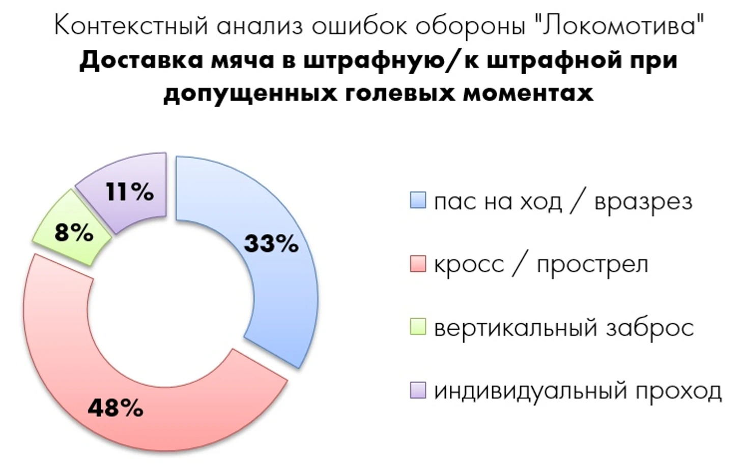 При этом проблемы на флангах «Локомотива» отчасти маскируются приличной игрой основной пары центральных защитников Кверквелия – Чорлука «на втором этаже». Как следствие, только в каждом третьем ключевом эпизоде доставка мяча с периферийных зон осуществлялась по воздуху (единственный пропущенный мяч – в прошлом туре от «Динамо»), но в большинстве случаев соперник использовал низовые розыгрыши (прострелы / передачи на ход / проходы с дриблингом).