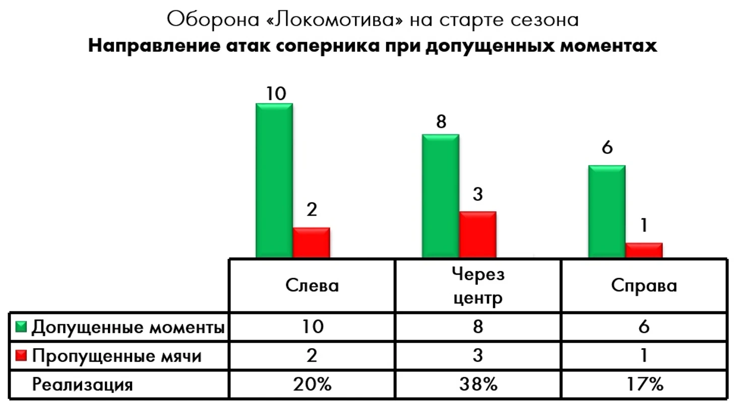 Что касается характера этих ситуаций, проблемы у «Локо» возникают как при статичной позиционной обороне (14 допущенных моментов из 30, хотя и только два пропущенных мяча – от «Краснодара» и «Динамо»), так и при потерях владения на чужой половине поля и неудачных попытках контрпрессинга (так пропускались мячи от «Оренбурга» и «Анжи»).