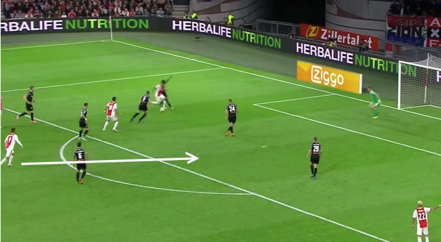 Второй фактор - Зиеш может появиться абсолютно на любом участке поля и именно от этих смещений начинается всё командное движение Аякса. Любимый маневр Зиеша - отойти в глубину поля за мячом, откуда он может выполнять средние и длинные передачи с левой ноги.