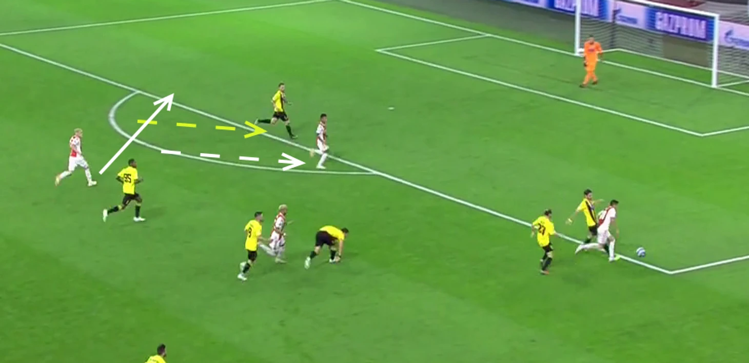 Давид Нерес, имея опыт игры на фланге, часто смещается туда, меняясь с кем-то из вингеров. Обладая хорошей скоростью, Нерес хорошо находит зоны за спинами защитников и делает туда рывки - необходимый элемент для разнообразно атакующей команды и важный в свете того, что формально играющие на флангах Тадич и Зиеш делают это крайне редко.