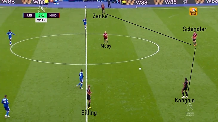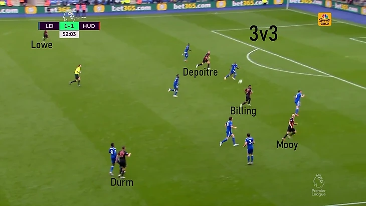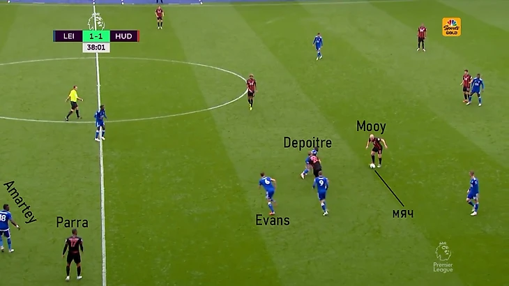 Если же «Хаддерсфилд» все-таки преодолевал начальный прессинг соперника, то затем следовала передача верхом к чужой штрафной от крайнего защитника на трех ускоряющихся партнеров. Набеги совершали все тот же Депуатр, Муй и Биллинг.