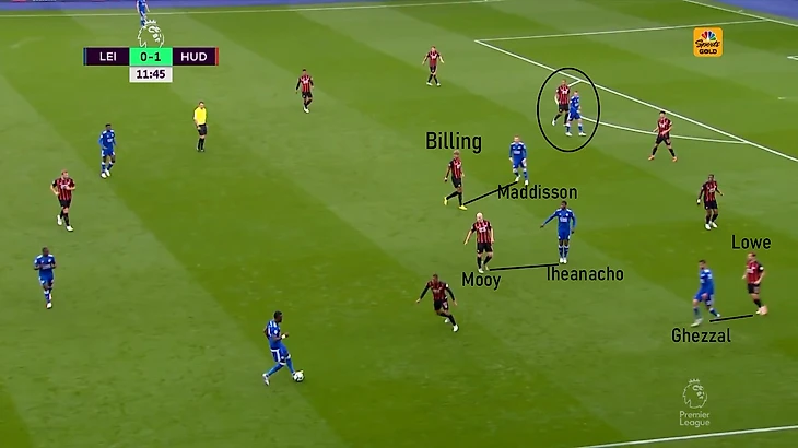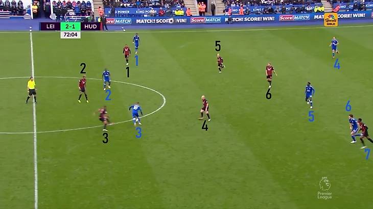 2. «Лестер» с трудом вскрывал 5-4-1 Вагнера. «Хаддерсфилд» без мяча распологался по очень жесткой структуре – до последнего момента игроки старались не покидать свои позиции, сохраняя двухлинейную систему. Когда владение «Лестера» переходило на половину поля гостей (а происходило это крайне часто), футболисты «Хаддерсфилда» играли персонально по соперникам. Особенно плотно опекался Мэддиссон, за которого отвечали поочередно Муй и Биллинг.