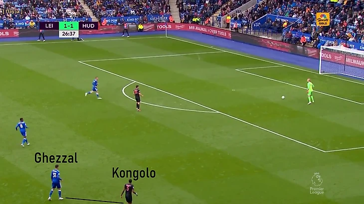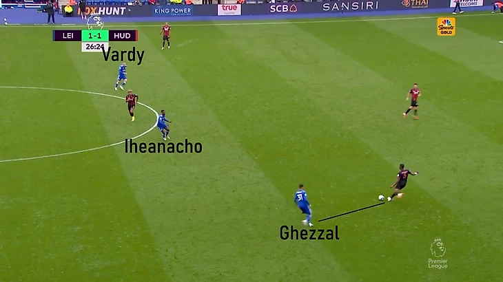 «Лестер» прессингует, мячом владеет Конголо. Геззаль поднимается выше Ихеаначо и Варди, прессингуя голландца.