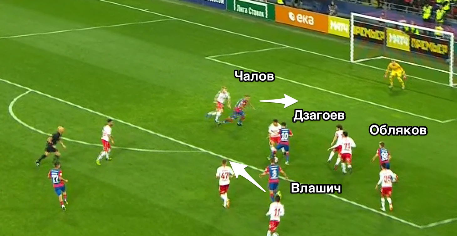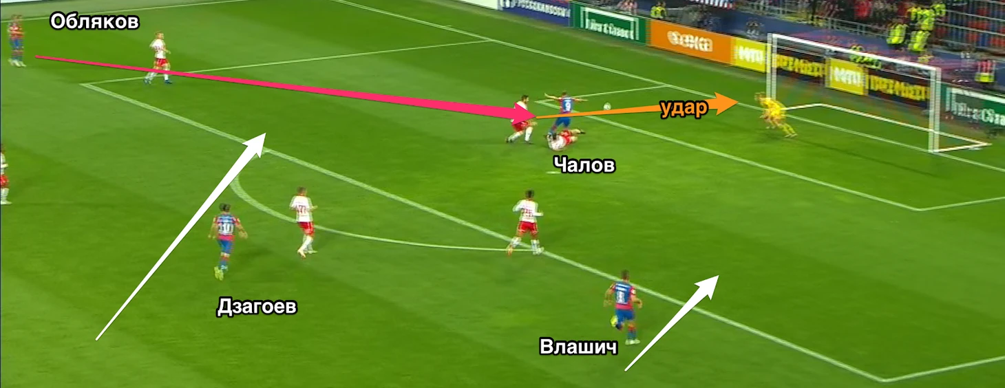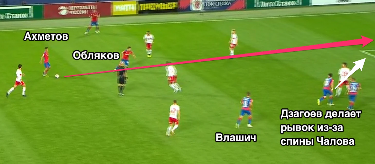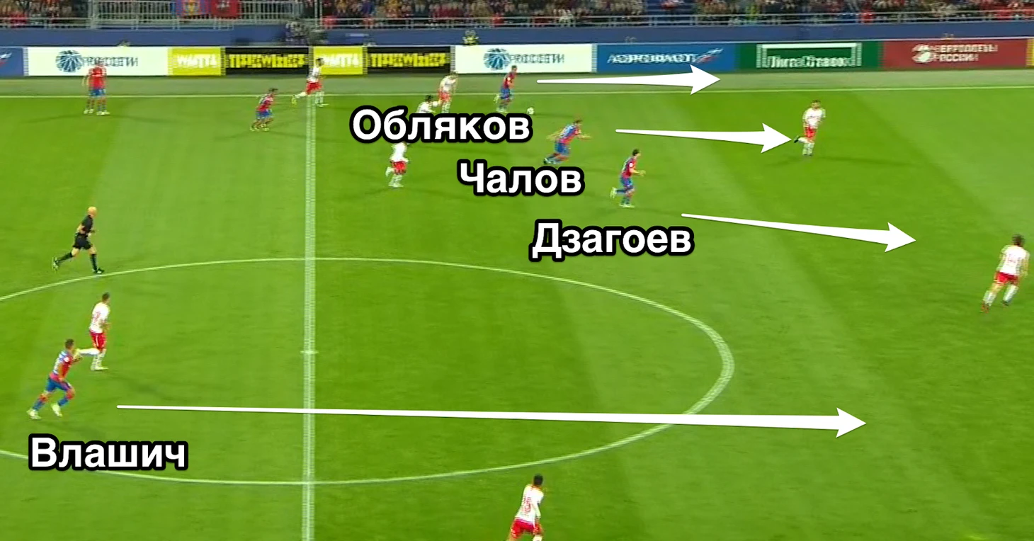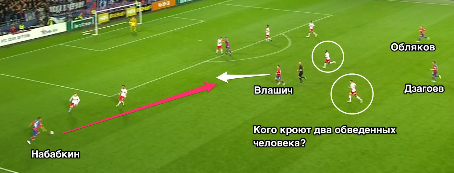 По сути, и Дзагоев и Влашич играли на одной позиции, что-то типа “правого полуцентрального атакующего полузащитника”. В этой ситуации, Фернандес остался один на один со своей судьбой человека, отвечающего за весь фланг, а Набабкину помогал Обляков. Кстати, в этом матче был просто колоссальный перевес по навесам в пользу ЦСКА: 20 - 6. Из них 9 сделал Обляков, не в последнюю очередь благодаря отвлечению внимания на Набабкина. Хотя, по иронии судьбы именно Набабки сделал ту самую голевую передачу на Влашича.