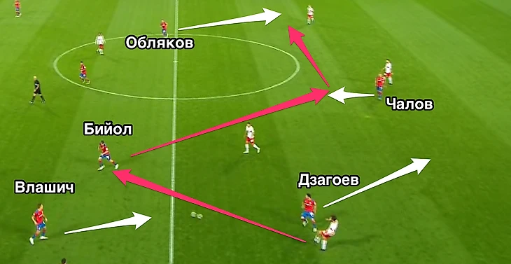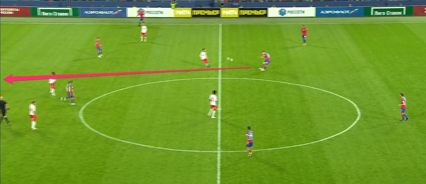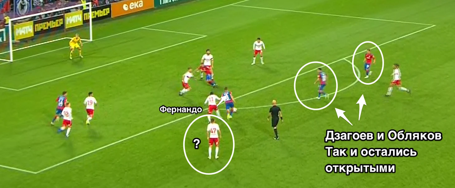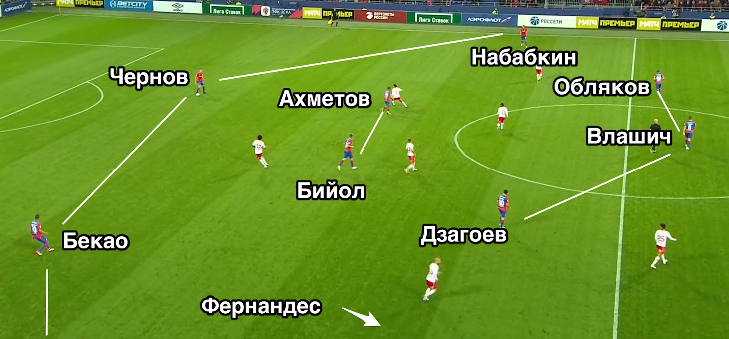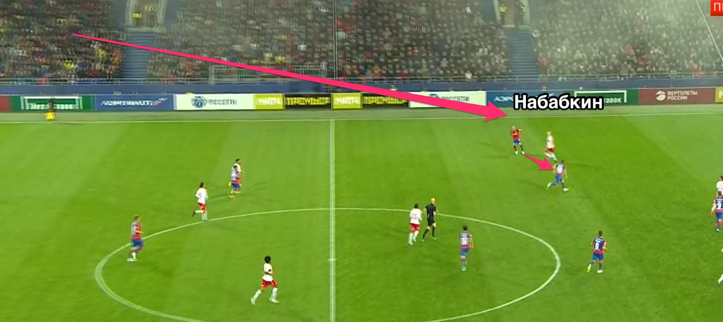 По сути, и Дзагоев и Влашич играли на одной позиции, что-то типа “правого полуцентрального атакующего полузащитника”. В этой ситуации, Фернандес остался один на один со своей судьбой человека, отвечающего за весь фланг, а Набабкину помогал Обляков. Кстати, в этом матче был просто колоссальный перевес по навесам в пользу ЦСКА: 20 - 6. Из них 9 сделал Обляков, не в последнюю очередь благодаря отвлечению внимания на Набабкина. Хотя, по иронии судьбы именно Набабки сделал ту самую голевую передачу на Влашича.