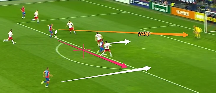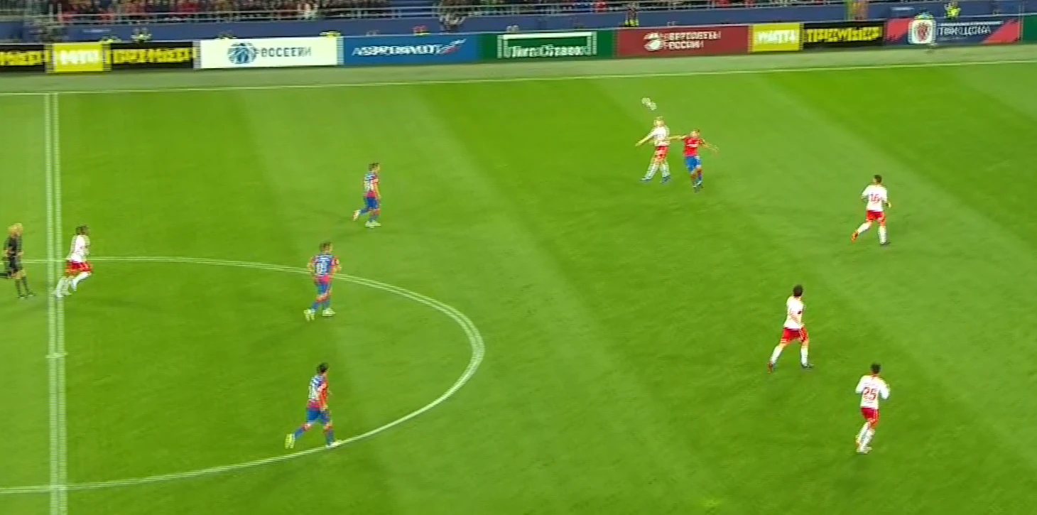 Такое сбегание всех трех атакующих полузащитников ЦСКА в сочетании с нормальными перемещениями Чалова, периодически вносили сумбур и панику в защитных редутах Спартака. Проблема ЦСКА в другом: мяч в зону “¾” не так уж и просто было доводить, особенно с учетом склонности ЦСКА к длинным передачам. Это вопросы уже следующего раздела.
