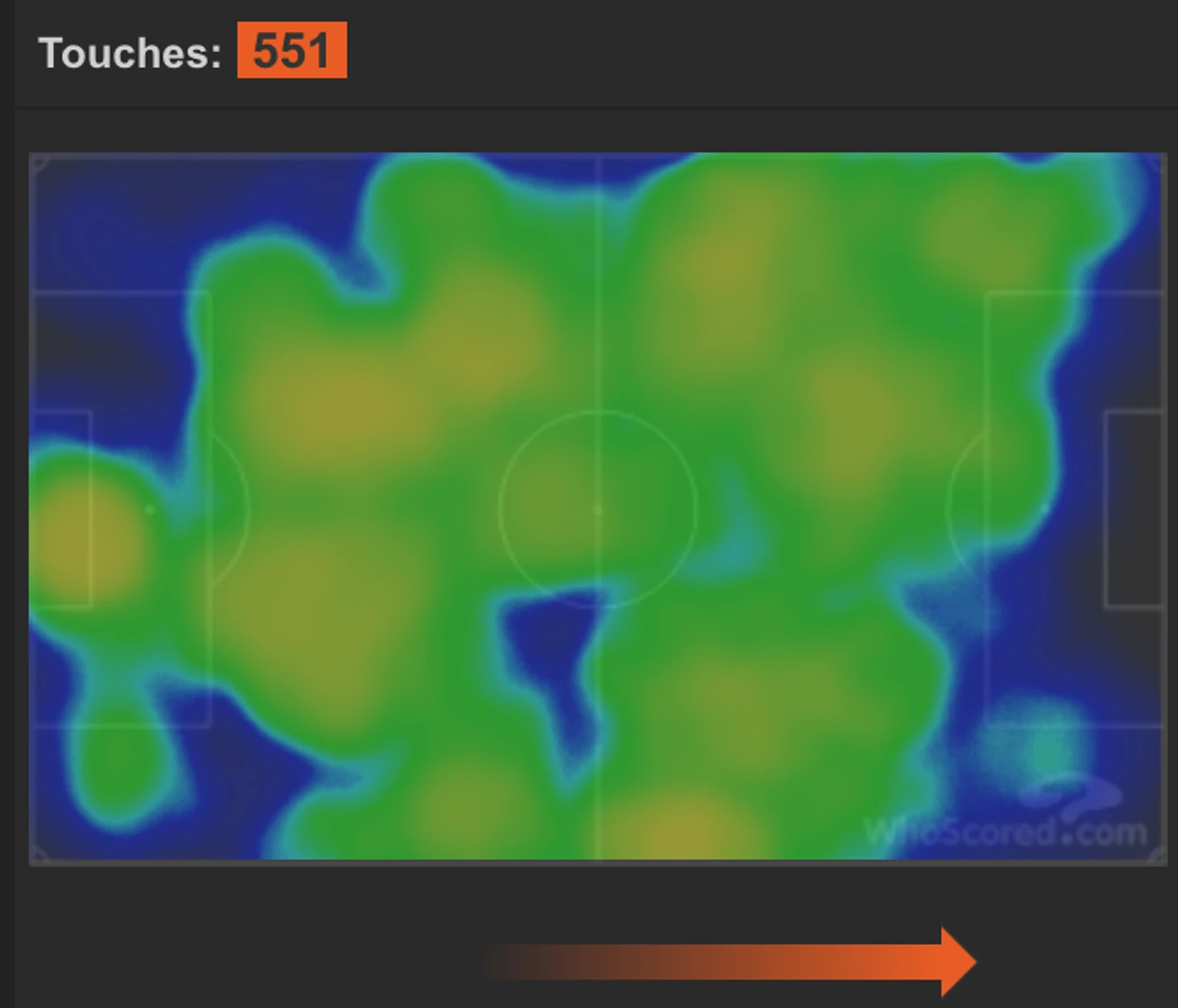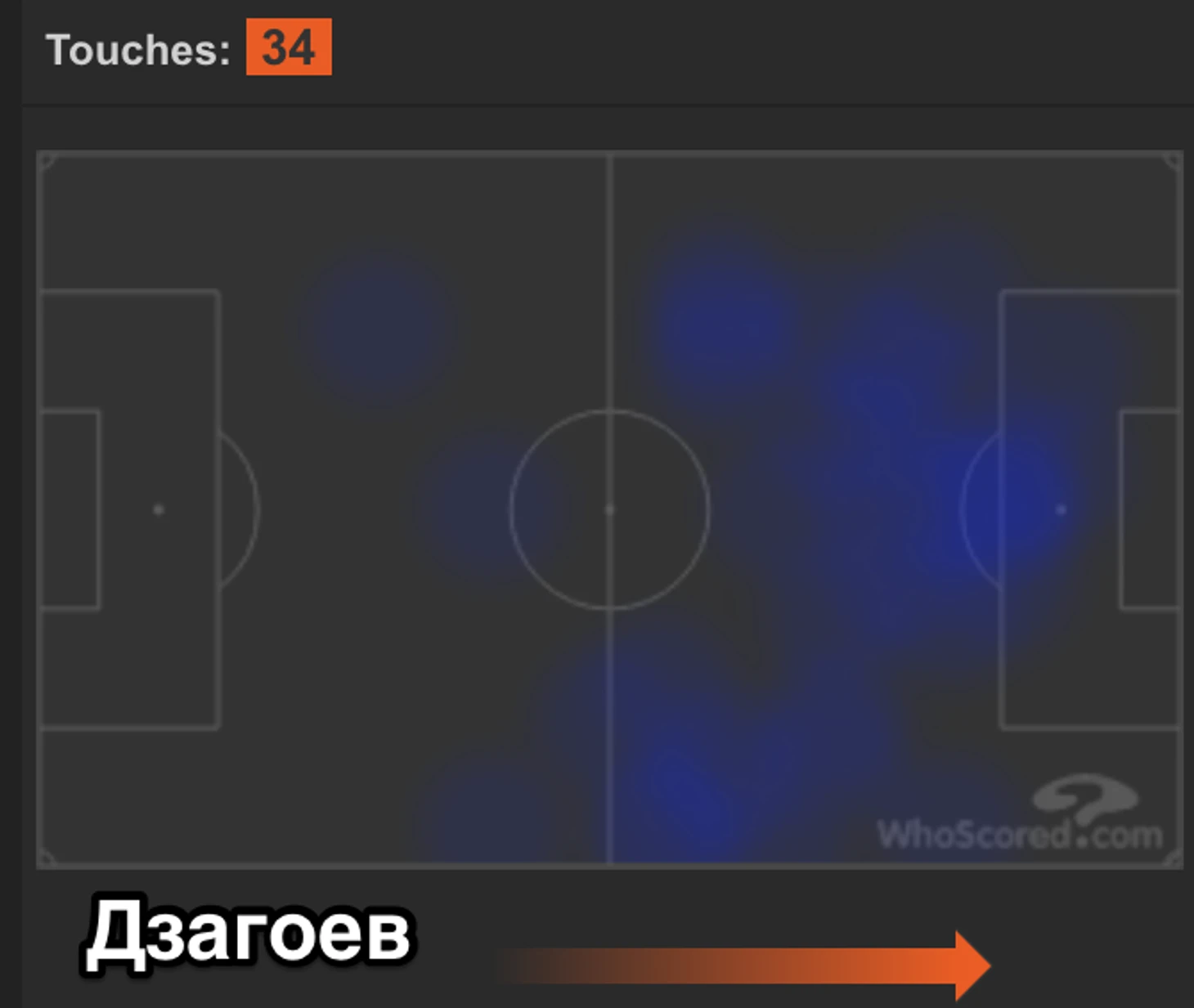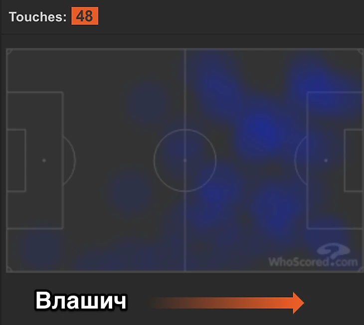 Если вы не догадались, то здесь я снова вернусь к паре Дзагоев/Влашич, которые стали практически неразлучными в этом матче. На самом деле, их тепловые карты касаний даже без микроскопа и не различишь, похожие у них были передвижения.