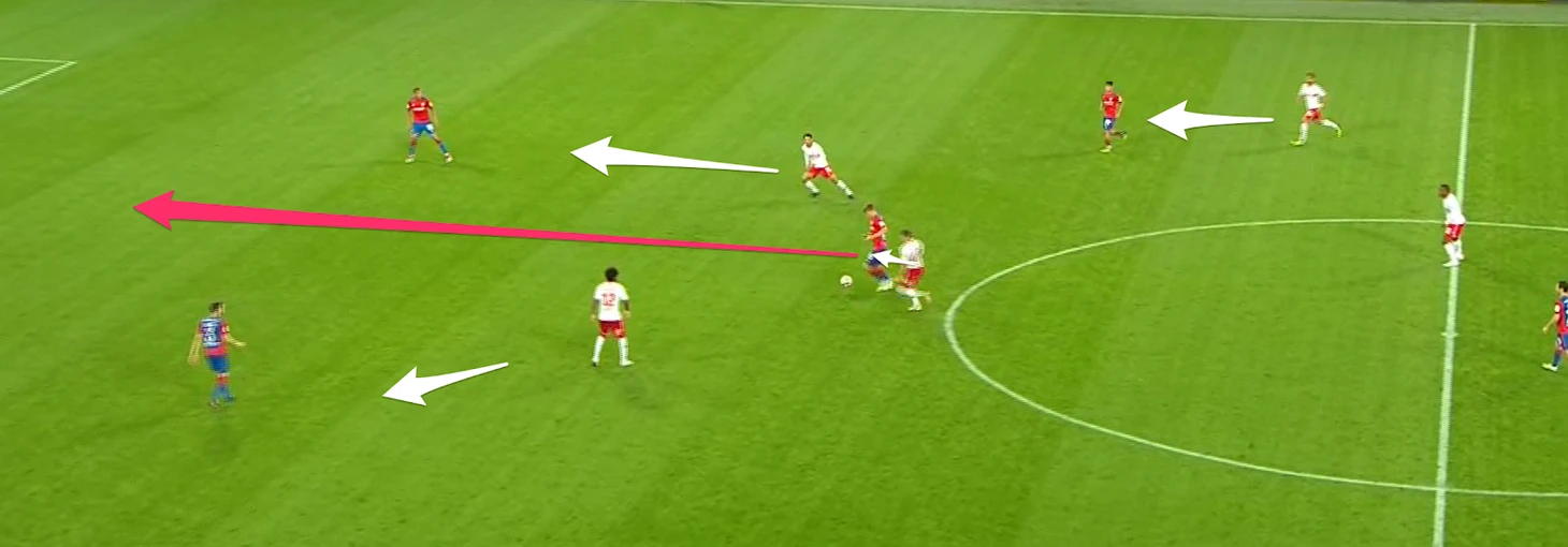 И нельзя сказать, что эта идея оказалась прямо таки абсурдной или нежизнеспособной. На фоне слабой комбинационной игры ЦСКА в целом (70% точных передач - это самый низкий показатель из всех моих обзоров 2018 года), такие телодвижения Дзагоева и Влашича добавляли определенной остроты позиционным атакам ЦСКА. Это позволяло и от опорников Спартака эффективнее отрываться, и защитникам создавать неприятности. Соперникам армейцев в таких ситуциях очень тяжело следить за перемещениями сразу двух взаимозаменяемых полузащитников между линиями. Элемент неожиданности ждет и центральных защитников, которые должны угадывать, кто из трех игроков (включая Чалова) сейчас может стартануть.
