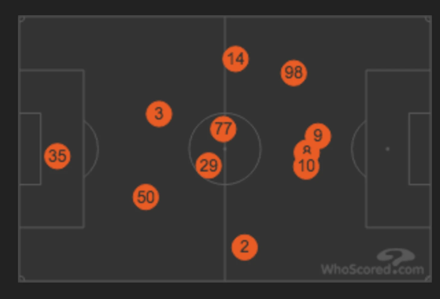 Кстати, по средней позиции 10-8-9, видно, что в зоне Фернандо паслось трое, что и привело к большому числу длинных передач, ибо никто не знает как выходить в пас без Фернандо.