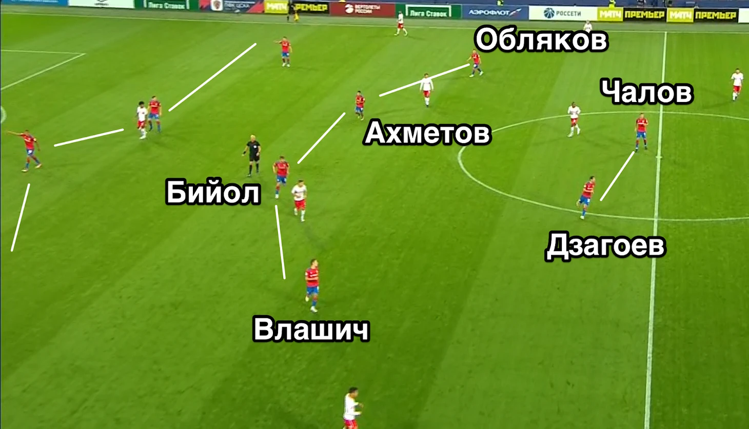 Здесь хоть убейте меня, но я даже близко не увидел игру в три защитника. Как, по мне, то ЦСКА играли типичные 4-2-3-1. Я бы сказал, в очень узкие 4-2-3-1, в которых Дзагоев и Влашич играли в +- одних и тех же зонах, а кто-то из них периодически смещался ближе к правому флангу.