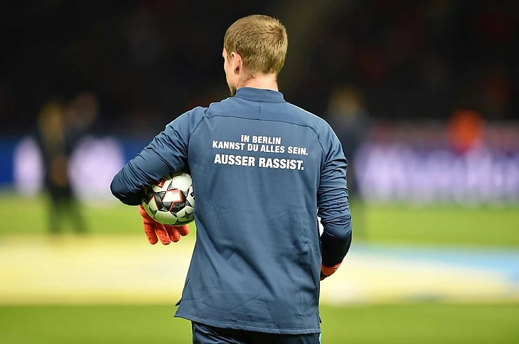 Перед пятничным матчем против «Баварии» игроки берлинской «Герты» вышли на разминку в футболках с надписью «В Берлине ты можешь быть кем угодно, но только не расистом».