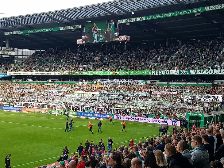 Фанаты «Вердера» тоже продемонстрировали свое неприятие расизма: «Против фашизма», «Добро пожаловать, беженцы», «Расизм убивает»