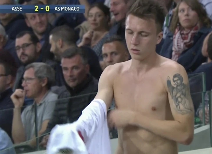 Перед выходом на поле россиянин переодевал футболку, обнажив торс. Футболист попал в объективы фотокамер, которые зафиксировали на его левом плече татуировку с изображением ангела.