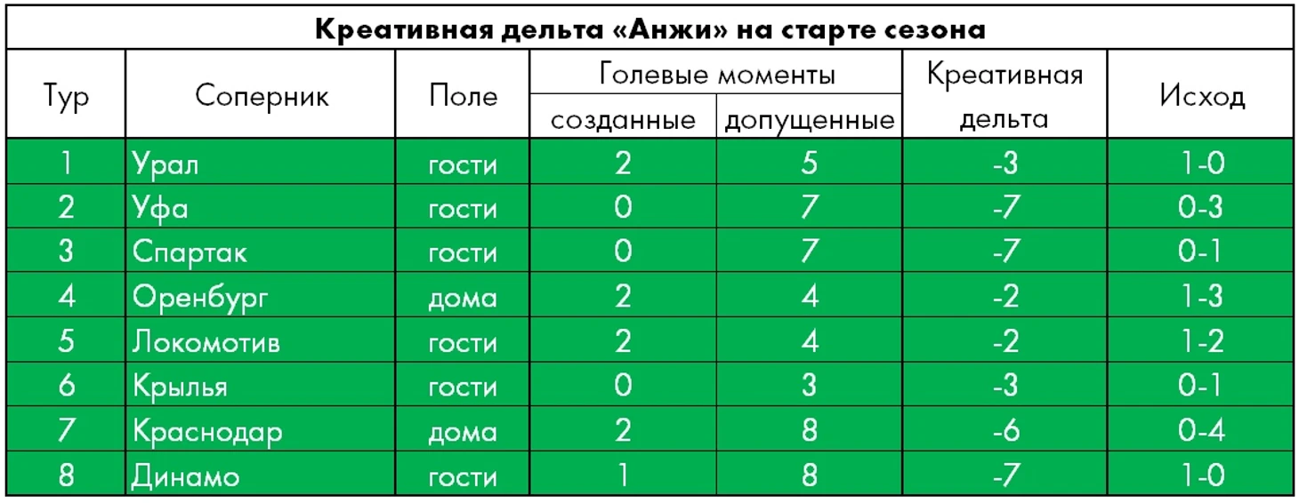 Переход на схему с тремя центральными защитниками (при Скрипченко «Анжи» играл по схеме 4-2-3-1) и низкий оборонительный блок пока не обеспечивает команде должного игрового баланса, что выражается и в катастрофическом соотношении созданного и допущенного (9-45). Не только контекстные, но и почти все базовые статистические показатели у махачкалицев – как атакующие, так и оборонительные – самые слабые в лиге.