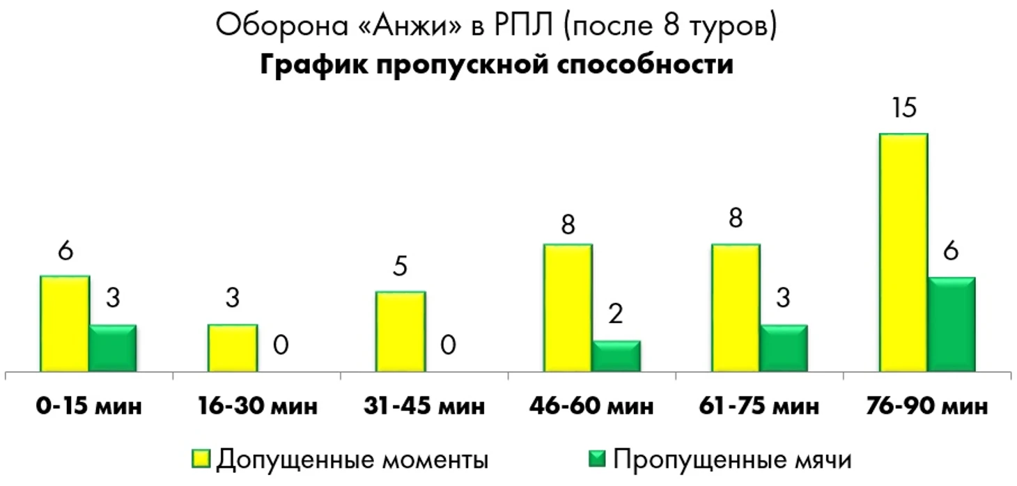 Отчасти беды «Анжи» связаны с неидеальной физической формой игроков, что и неудивительно с учетом их скомканной предсезонки. Если в первых таймах команде еще удаётся сохранять целостность оборонительной структуры, то после перерыва махачкалинцы неизбежно «проседают», а в последней 15-минутке их состояние скорее можно описать как судорожное (треть допущенных моментов – именно на этом игровом отрезке).