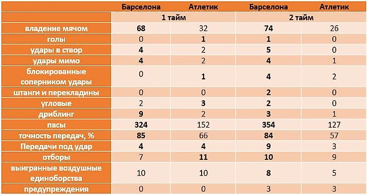 Месси и Бускетс появились на поле на 55й и 51й минутах соответственно. Причем, если Бускетс по позиции заменил Роберто, то Месси вышел вместо Видаля и взял на себя роль «десятки», расположившись под тремя нападающими. Чтобы понять роль этих футболистов в командной игре обратим внимание на следующие цифры. В первом тайме игроки «Барселоны» 9 раз успешно применили дриблинг и выполнили 4 передачи под удар, после перерыва дриблинг был применен всего 3 раза, а вот количество передач под удар увеличилось до 9. Эти факты как раз лучшим образом характеризуют то, что «Барселона» с выходом Месси стала играть в более командный футбол. Сам аргентинец отметился 5 ударами, один из которых угодил в штангу, а также именно он выполнил прострел, который на 84й минуте замкнул Мунир и принес одно очко своей команде. Также отметим, что во втором тайме «Атлетик» нанес всего 3 удара, 2 из которых были заблокированы, а один пролетел мимо.