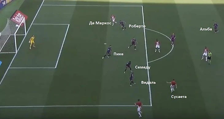 В конце первого тайма «Атлетик» все же добился своего. В этот раз Альба забыл о том, что он в первую очередь защитник. Хорди даже близко не успевал на свою позицию, когда из нее забивался мяч. На подстраховку опустился Серхи Роберто, но как показал эпизод, испанец скорее обозначал опеку Де Маркоса, чем реально ее выполнял. Он первым начал сигнализировать о якобы офсайде, которого, конечно, и в помине не было, так как в собственной штрафной уснул Пике. Также обратите внимание, что выполняющий пас Сусаета находится в совершенном одиночестве, абсолютно без давления он вырезает голевую передачу. Кроме этого паса у него еще есть и вариант с передачей на фланг, где партнер также один. Семеду почему-то глубоко сместился в центр, хотя там никого из соперников нет. Для опеки Уильямса вполне хватит двух центральных защитников. Видаль тоже завис в полупозиции, он и на Сусаету не выдвинулся, хотя вроде это именно его игрок, и фланг оставил открытым.