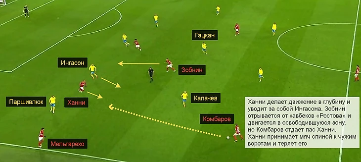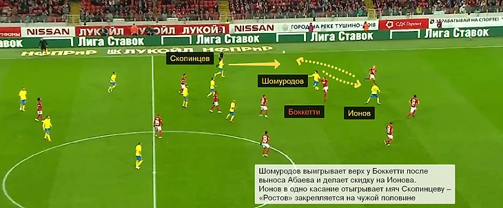 Перегруз центральной зоны на границе финальной трети «Спартаку» ничего не дал – мяч до атакующей тройки при ситуациях 1-в-1 не доходил, а переводы на Комбарова и открывания Мельгарехо в левый полуфланг происходили слишком медленно – «Ростов» успевал перестраиваться и перекрывать зоны.