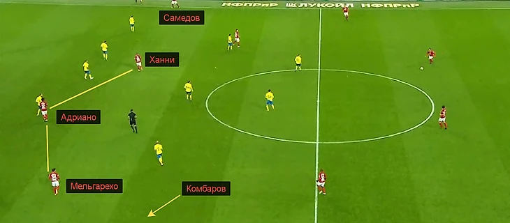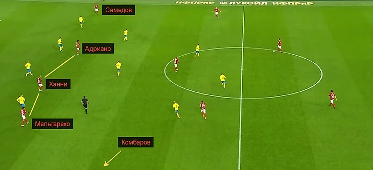 4. Функции фланговых полузащитников «Спартака» сильно различались. Самедов всегда был прикреплен к краю в первой фазе атаки, а Мельгарехо мог располагаться как на фланге, так и уходить в центр. При таких смещениях схема хозяев трансформировалась едва ли не в 3-2-5 – Рассказов располагался справа, но почти на одной линии с Боккетти и Джикией, Комбаров поднимался очень высоко, а Зобнин и Фернандо находились в центральном круге.