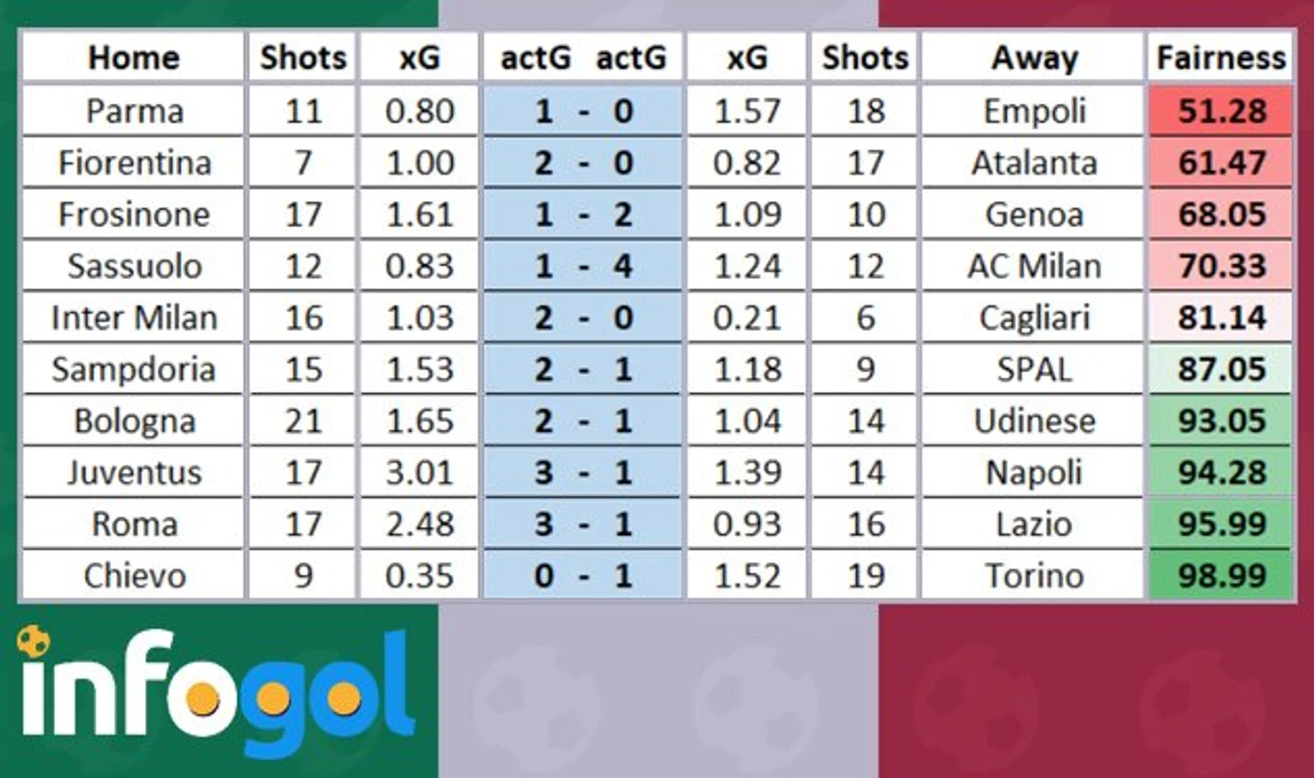 Оценка справедливости результатов 7-го тура Серии А от Infogol