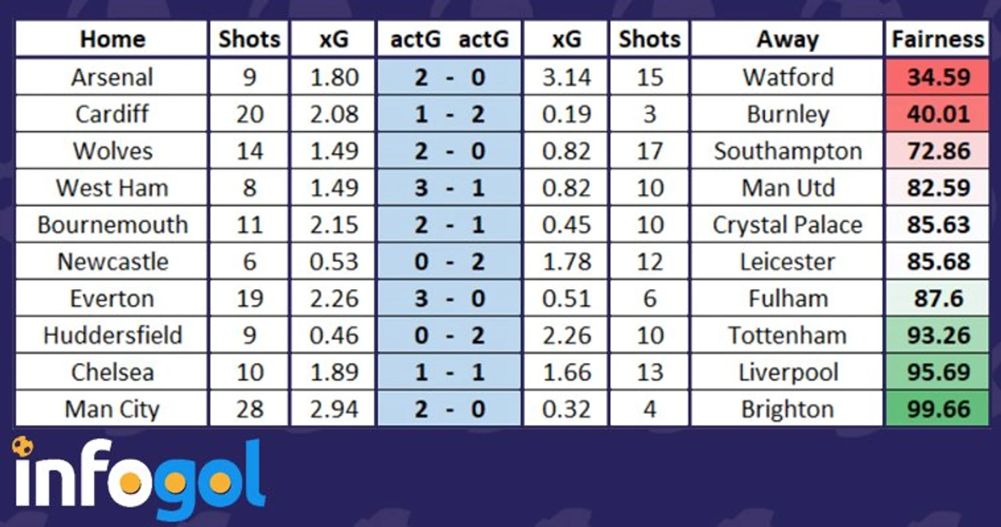 Самым несправедливым (с точки зрения модели xG) результатом стала домашняя победа "Арсенала" над "Уотфордом" со счетом 2-0.
