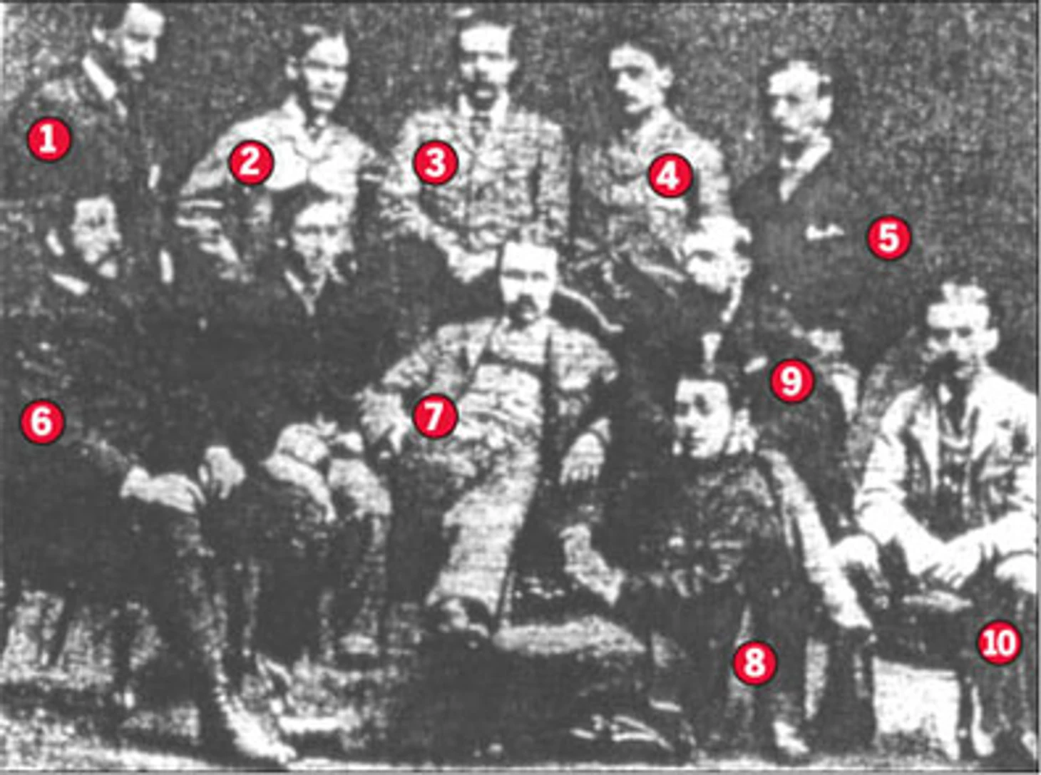 Первое фото сборной Англии по футболу. Чарльз Смит (номер 3) и Артур Сэвидж (номер 6). Ненумерованный человек – официальный представитель «Пэлас» Джеймс Тернер, который был судьей матча.