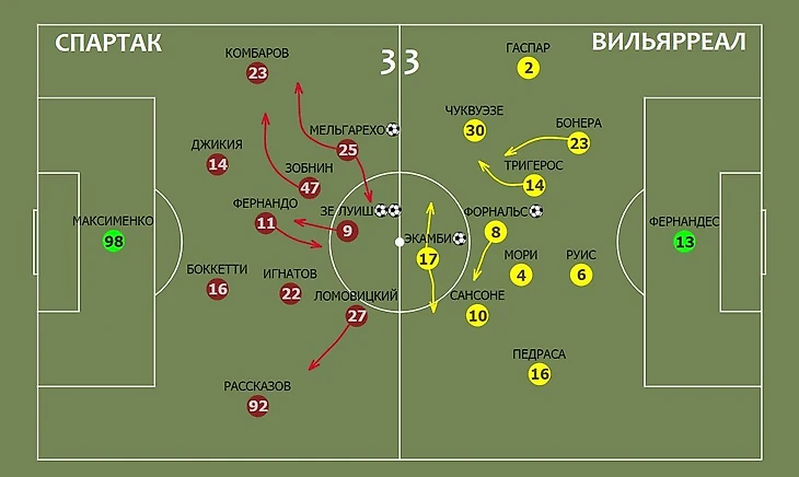 Такой метод переводов позволял «Спартаку» отодвигать игру ближе к чужим воротам и продолжать комбинацию с формированием динамичной тройки. На первых минутах именно активность молодых футболистов хозяев была основным методом давления на «Вильярреал». Смело двигался вперед Рассказов, несколько раз перспективно открываясь в полуфланге, мобильностью выделялся и Игнатов.
