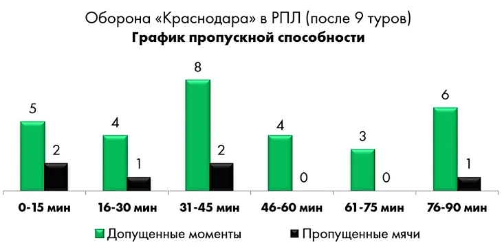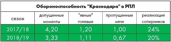 На протяжении большей части прошлого сезона «Краснодар» защищался на уровне дремучих аутсайдеров (4,2 допущенных момента за матч – итоговый 12-й показатель в лиге), хотя и оказался в середняках по пропущенным (30 мячей).