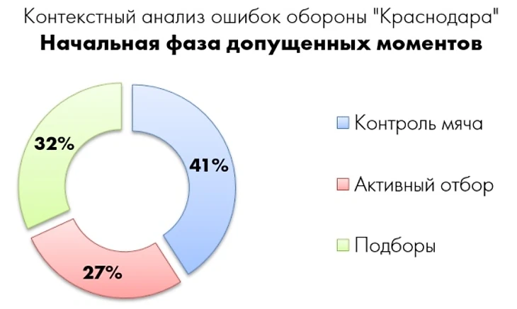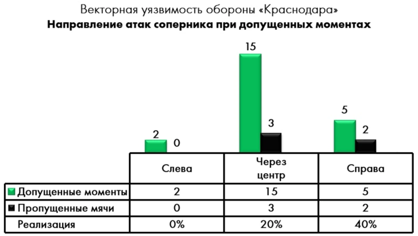 «Быки» не слишком уверенно чувствуют себя в переходных фазах после потери владения – 60% ситуаций с допущенными голевыми моментами у ворот Крицюка (13 моментов / 4 явных) возникали именно после потерь, в том числе и необязательных. Любопытно, что до сей поры «Краснодар» за это наказали только однажды – в матче первого тура с «Рубином» фееричный обрез в исполнении Смолова закончился голом Азмуна.