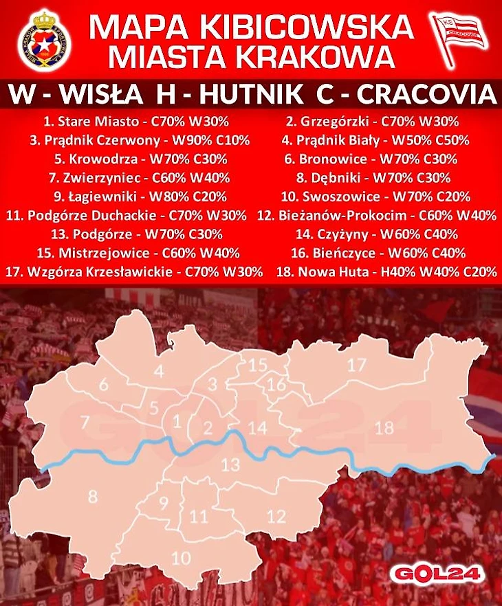 Своеобразной границей между двумя крупными блоками фанатов является река Висла. «Белая звезда» имеет преимущество в южной части города, а именно в районах Подгуже, Дембники, Свошовице, Лагевники. Несколько районов в северной части Кракова (Прадник Червоны, Кроводжа, Броновице, Беньчице) тоже принадлежат «вислякам». «Красно-синих» поддерживают не только краковчане, «Висла» довольно популярна в Малопольском воеводстве. Так, практически на каждой игре «Вислы» присутствуют фанаты клуба из Мысленице, Олкуша, Бохня, Явожна.