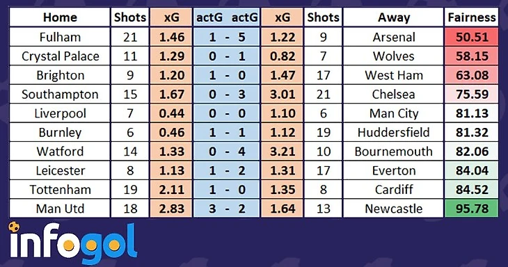 Самым несправедливым (с точки зрения модели xG) результатом стала гостевая победа "Арсенала" над "Фулхэмом" со счетом 5-1.