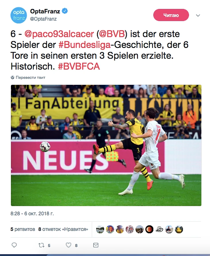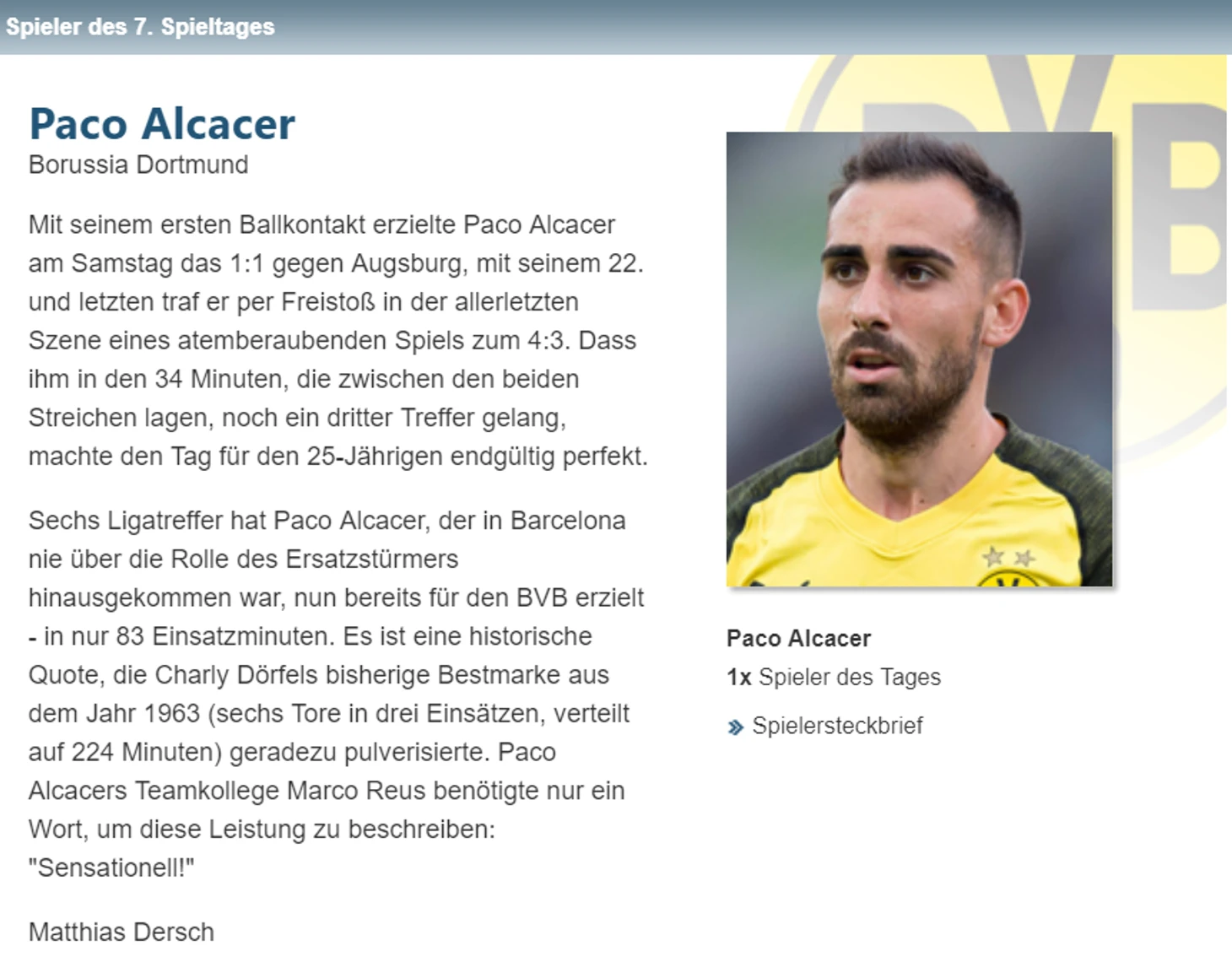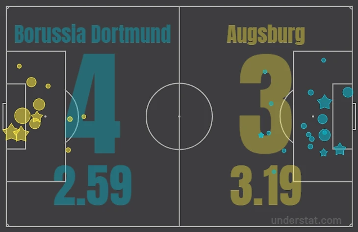 Защита «желто-черных» выглядела в такой игре ужасно, по xG «Аугсбург» даже превзошел хозяев (больше 3!) и заслуживал как минимум ничьей. Однако напор «шмелей», настойчивость Пако Алькасера и неуверенная игра защитников и вратаря «фуггеров» принесли победу Боруссии. Когда за 3 минуты до конца Грегорич в очередной раз сделал счет равным 3:3, хозяева заперли «Аугсбург» у канатов (в смысле в штрафной), создавали один момент за другим и, наконец, на шестой добавленной минуте Пако Алькасер отменно пробил штрафной, принеся себе хет-трик, а команде – нелегкую победу.