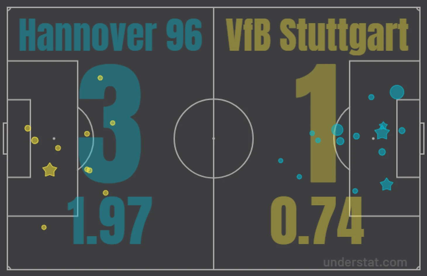 Этот матч начался обоюдными атаками, но «швабы» свои шансы упустили, а «Ганновер» забил два гола-близнеца: Альборноз навешивает на Вуда и тот без помех забивает головой.