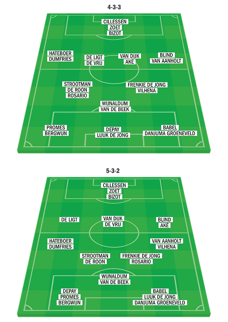 Рональд Куман почти наверняка останется верен своим принципам в сборной. Выбирать тренерский штаб будет между оборонительной 4-3-3 (с двумя опорниками) и ее более осторожной вариацией 5-3-2. Приглашенные на два ближайших матча (с Германией и Бельгией) футболисты отлично подходят к таким построениям. Классический голландский вариант 4-3-3 (два атакующих хавбека) возможен против Бельгии.