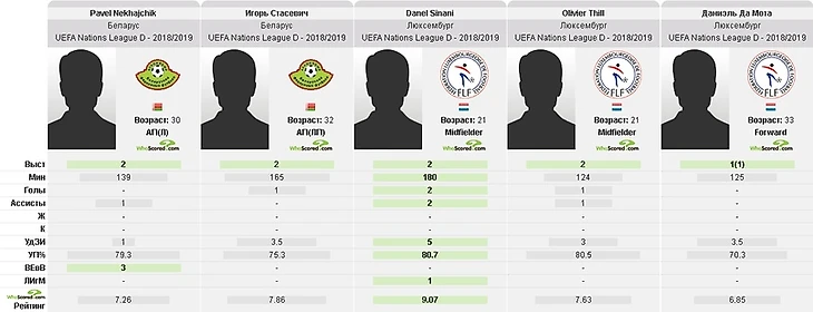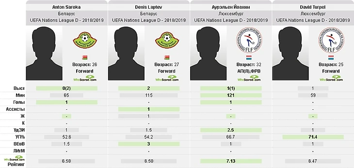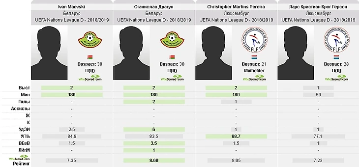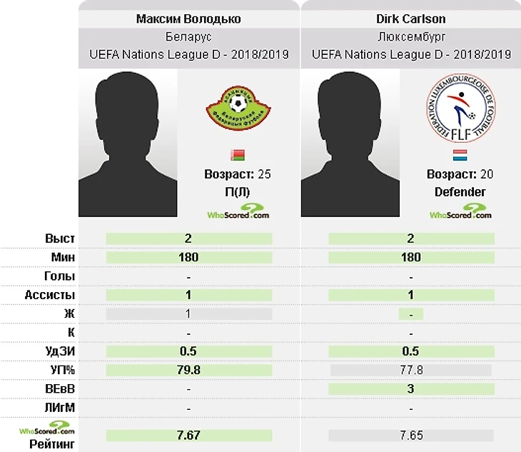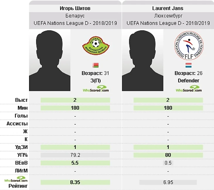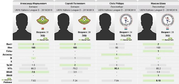 4. Центральные защитники. В центре поля, вероятнее всего, мы увидим Мартыновича, Политевича, Филипса и Шано. Филипс играл в основном матче с Молдовой и неплохо себя проявил, остальные отыграли по два матча. Как мы можем отметить, на данной позиции также есть небольшое превосходство по оценкам у Люксембурга после матчей с одними и теми же соперниками.