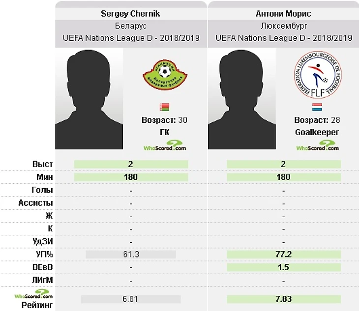 Вратари. Оба сыграли два матча, естественно, по 90 минут, и не пропустили ни одного мяча, однако оценка Мориса гораздо выше. Во многом это за счёт того, что работы у него было побольше, Люксембург не играл с той же Молдовой в столь закрытый футбол или тотальный контроль.