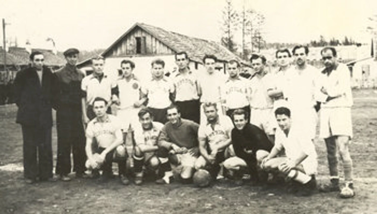 Две команды русских харбинцев, участвовавших в «Чемпионате Европы». Лагпункт 013 Особого лагеря №7, ст. Вихоревка, Иркутская обл. 1955-й