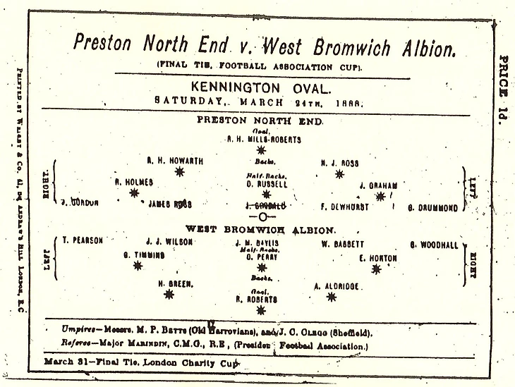 На пути к финалу 1888 года «Норт Энд» в целом выносил всех, кого можно, в том числе и действующего обладателя «Астон Виллу» (3:1). Их разница мячей немного пугала – 49-3. Год назад «дрозды» победили эту «машину» благодаря исключительному старанию, полной концентрации и большой удаче. «ПНЭ» тогда атаковал практически все полтора часа, но счет долго оставался ничейным. Взрыв случился на последних минутах, когда «Альбион» сумел выйти вперед. «Престон» решил отыгрываться всей командой и пропустил третий мяч.