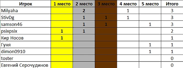 В данном рейтинге немного другие герои: к Milyaha, который ударнее всех начал сезон, присоединились Гена StivDg и Роман samson46 - парни по 3 раза были в топ-5 по итогам тура.
