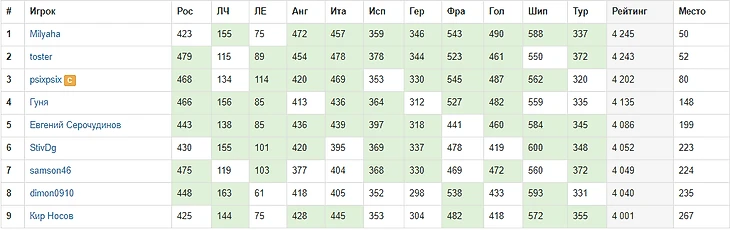 Нашими текущими лидерами по ФО во всех турнирах являются Milyaha, toster и psixpsix, которые входят в первую сотню общего рейтинга.