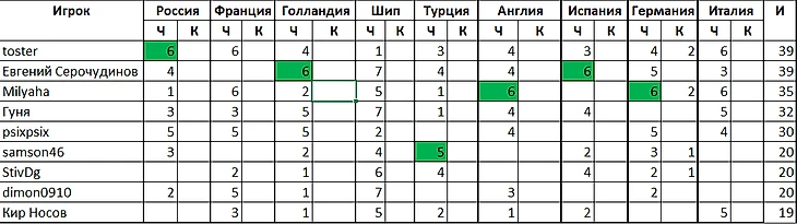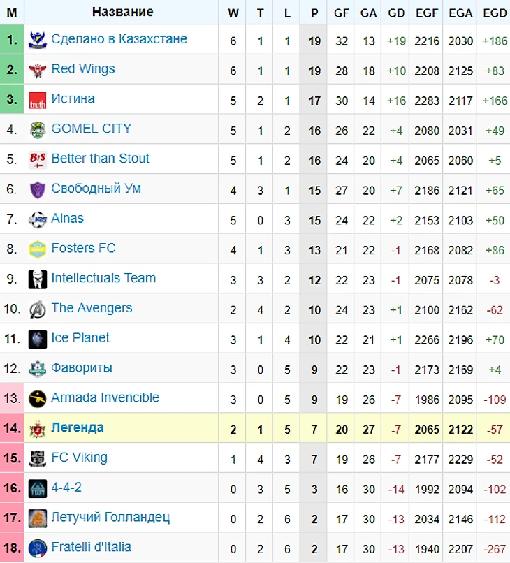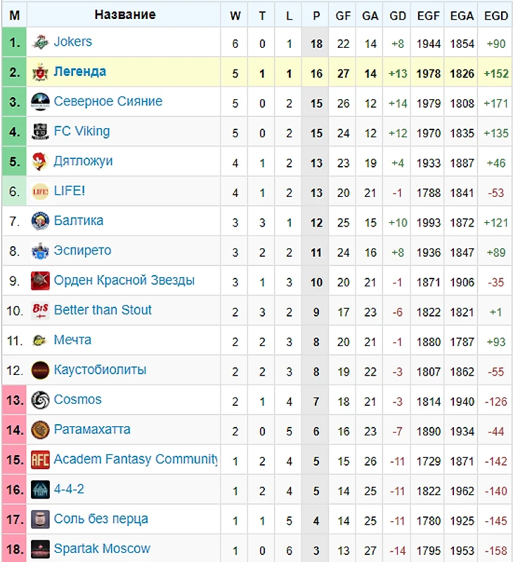 Бодро начав с 4-х побед в первых шести турах, шли в лидерах турнира, но 4 поражения подряд, последовавшие потом, унесли нас в зону вылета. Беспокоит то, что за 10 туров мы ни разу не вошли в топ-5 по ФО по итогам тура и по этому показателю идем на почетном 66-м месте. Не могу не выделить индивидуальные достижения Романа samson46, который 5 раз становился лучшим в нашей команде по ФО, правда, забив при этом всего 3 гола.