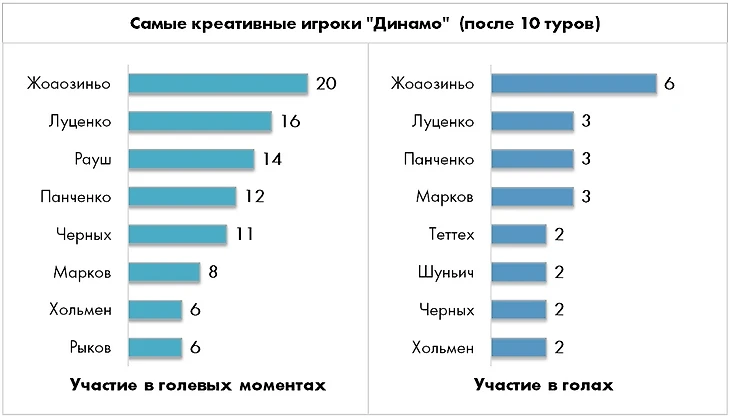 В прошлом сезоне главным оружием «Динамо» были контратаки (12 мячей в быстром нападении – четвертое место в лиге), а в роли главного разгоняющего выступал Александр Ташаев. После бегства хавбека в «Спартак» динамовская атака несколько потеряла в динамике, хотя за счет подписанного летом Жоаозиньо частичная компенсация все же произошла.