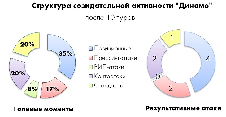 В отличие от прошлого сезона, когда динамовцы не брезговали пресловутой «автобусной» тактикой, сейчас команда почти не играет «в откат», охотно владеет мячом (50,3% против 47,8% в минувшем чемпионате) и большинство атак доводит до логического завершения. Бело-голубые идут в числе лидеров по общему числу ударов (15,5 за игру), а по ударам из пределов штрафной (9,0) уступают только «Зениту» (10,0).