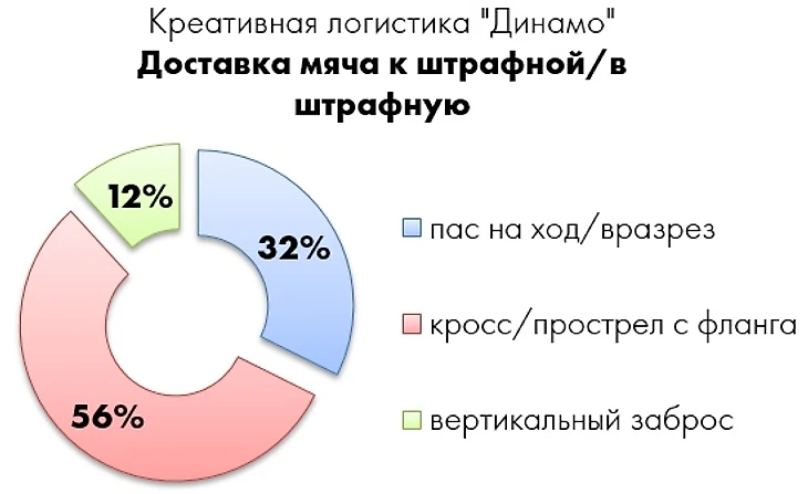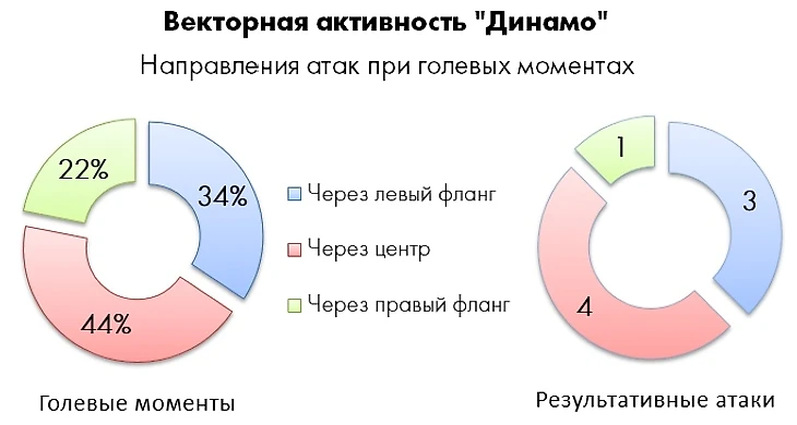 При Хохлове у атакующих игроков «Динамо» нет жесткой привязки к позиции, и чистого наконечника тоже – Луценко, Панченко, Марков, Жоаозиньо и Черных оказываются в острых ударных позициях примерно с одинаковой частотой. Постоянная смена позиций обеспечивает команде векторную вариативность, и все же приоритетным (особенно при позиционном владении) является левый фланг, где динамовцы постоянно нацелены на создание ситуаций 2v1.