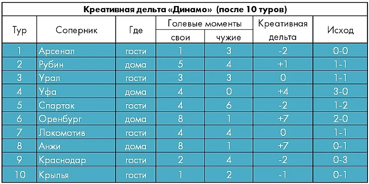 Если же брать в расчет только эпизоды с реальной голевой перспективой, «Динамо» в хорошем плюсе по сводной креативной дельте (40 созданных против 28 допущенных моментов) – и такое соотношение абсолютно нехарактерно для андердога, амбиции которого ограничены исключительно борьбой за выживание.