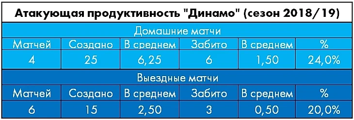 Динамовцам не хватает не только турнирной, но и внутриматчевой стабильности – команда включает полные обороты только в последней трети матча (более половины голевых моментов и 7 из 9 забитых мячей), причем по истечении часа игры бело-голубым не удавалось вести в счете ни в одном (!) из 10 поединков.