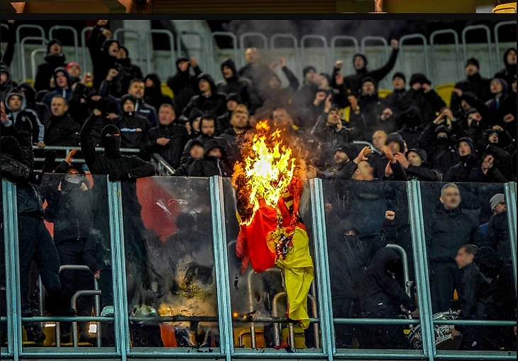 «Легию» снова не хотели пускать в Белостоке, тщательно обыскивали, но каким-то образом «легионисты» сумели пронести на трибуны два баннера «Яги», которые были сожжены.