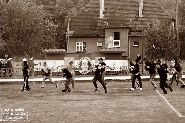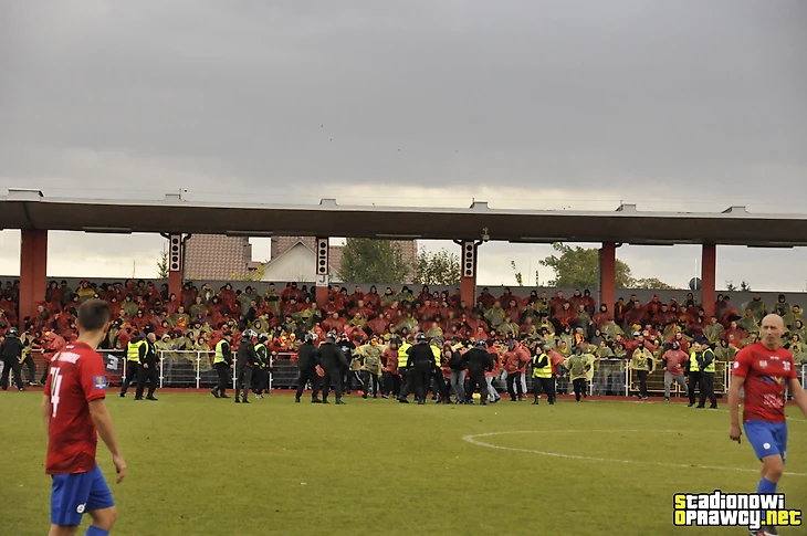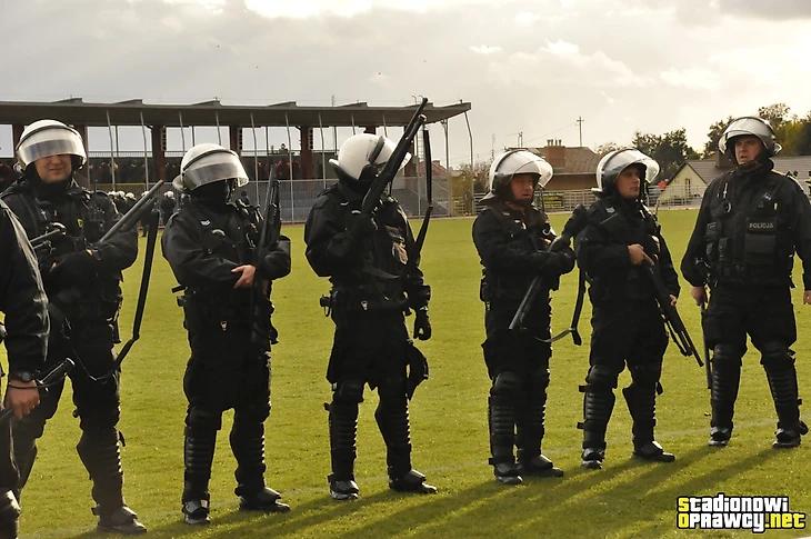 В окружном кубке Польши встретились «Пяст» из Новой Руды и «Гурник» из Валбжиха. Полиция готовилась к опасному матчу. их ожидания подтвердились. Фанаты хозяев по окончании матча пытаются прорваться к гостевому сектору, но их планы ломает полиция.
