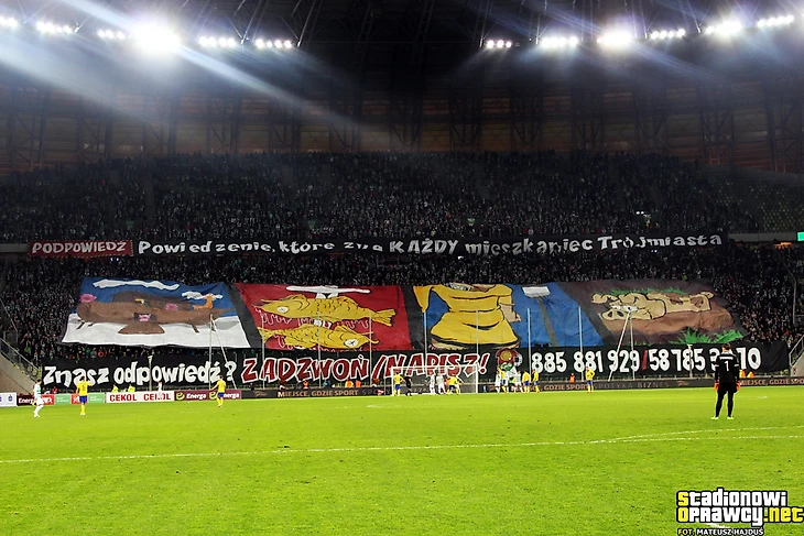 27-го октября прошли дерби Труймяста. О поездке в Гданьск вы можете прочитать в отдельном посте. На матч гданьчане подготовили две оправы. Первая состояла из баннера «Ultras Lechia Gdansk» и пиротехники.